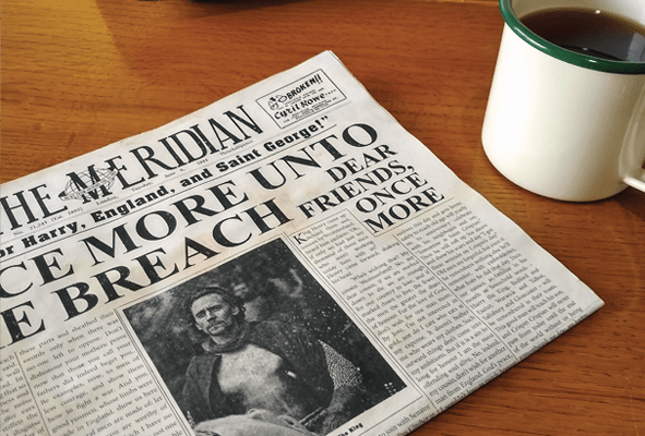 This is the first in what I hope to be a series relating to the news through different time periods, I want to use this range to explore various mediums. I started by creating a fake newsgroup called The Meridian and this first prop is a 1940’s broadsheet newspaper using Henry V as the main story.